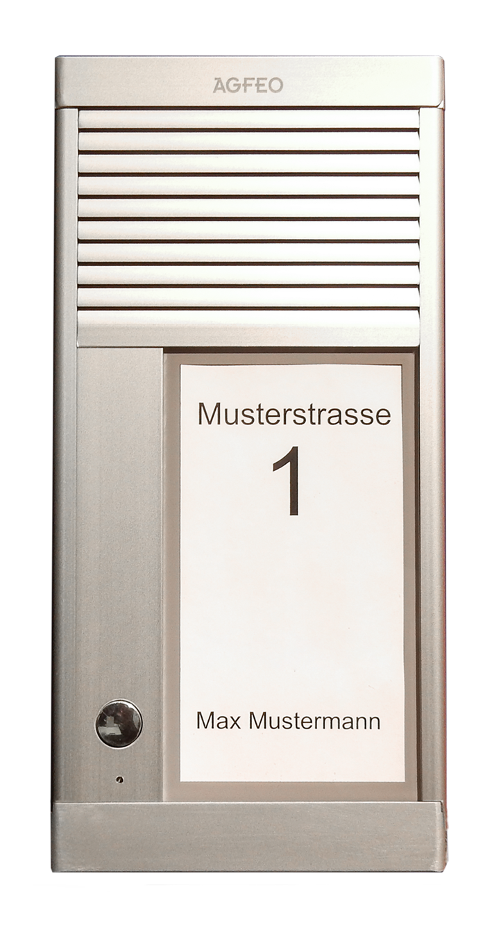 Die analoge AGFEO Türfreisprecheinrichtung DoorSpeak 1 bietet Lösungen für alle Anforderungen, flexible Bedienmöglichkeiten, Schutzklasse IP 33 und vieles mehr. Der Anschluss der Türsprechstelle erfolgt über eine analoge Nebenstelle Ihres Kommunikationssystems. Das flache Aluminium-Gehäuse ist 22 mm tief, mit einem Klingeltaster ausgestattet und für die Aufputzmontage vorgesehen. Das beleuchtete große Klingelschild (165 x 127 mm) bietet viel Platz für die eigene Gestaltung. Die AGFEO DoorSpeak 1 ist dank vorprogrammierter Klingeltaste optimal auf AGFEO ES-Systeme abgestimmt (Plug`n`Play).
